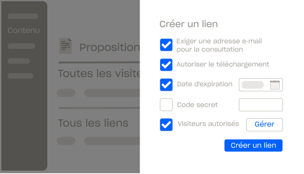 Protégez les communications sensibles des clients et leur propriété intellectuelle en un seul clic. Assurez la sécurité de vos clients grâce aux dates d'expiration des fichiers, à la protection par mot de passe, à la vérification des e-mails, aux accords de non-divulgation intégrés, etc.
