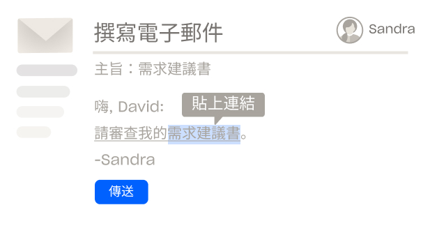 改用 DocSend 連結,向繁冗的電子郵件附件告別,迎接安全的檔案共享方式。只要幾秒就能分享多個連結,或傳送個人化的檔案請求。提供無縫的瀏覽體驗,可支援所有主要檔案格式。