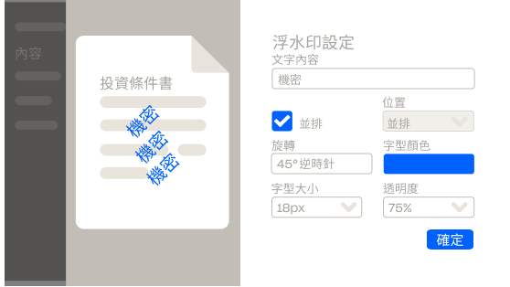 新增自訂文字,以及更改浮水印的顏色、位置及旋轉方向,呈現方式由您全面掌控。可將數位浮水印套用至 PDF、Keynote、Powerpoint 簡報和 Word 文件。