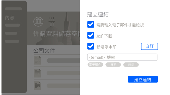 若需要一次共享多份文件,在每份文件上套用浮水印可不容易。將文件上傳至協作區後,就可以為每份文件套用動態浮水印,並以單一連結共享所有內容。