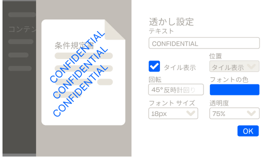 閲覧者の情報を自動的に表示して、電子透かしの効果を高めましょう。閲覧者のメール、IP アドレス、日時を反映する透かしを設定して、共有情報をさらに保護できます。