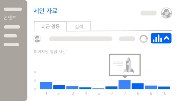 계약서, 가격 제안서 등을 유망 클라이언트에게 원활하게 공유하세요. 누가 공유 문서를 사용했는지 확인하고 가장 많은 클라이언트가 관심을 보인 거래에 시간을 할애하세요. 클라이언트의 흥미를 가장 크게 유발한 정보를 알아내어 클라이언트 회의를 손쉽게 준비할 수 있습니다.